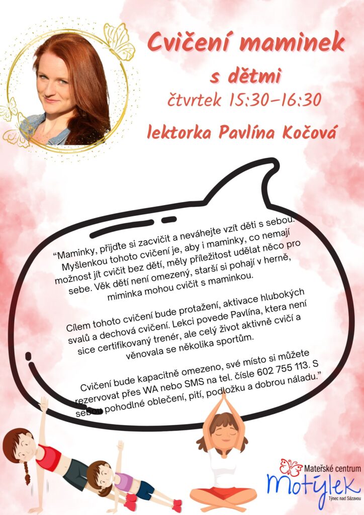 Tato lekce je určena zejména pro všechny maminky, které se chtějí protáhnout, udělat něco pro sebe a své tělo, ale zároveň u toho mají svá dítka, kterým je po celou dobu k dispozici herna a pobíhání mezi cvičícími maminkami nás nerozhodí 🙂 Přijďte si zacvičit se skvělou lektorkou Pavlínou, obtížnost bude přizpůsobena maminkám, které na lekce dorazí. Předem se prosím přihlaste (stačí formou sms) na tel.: 602 755 113 přímo lektorce.