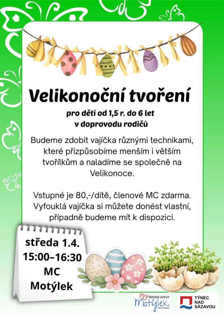velikonoční prázdniny budou letos u nás v Motýlku od čtvrtka 2. 4. do pondělí 6. 4. Po prázdninách se na vás budeme opět těšit v úterý 7. 4. na Zpívánkách 🙂